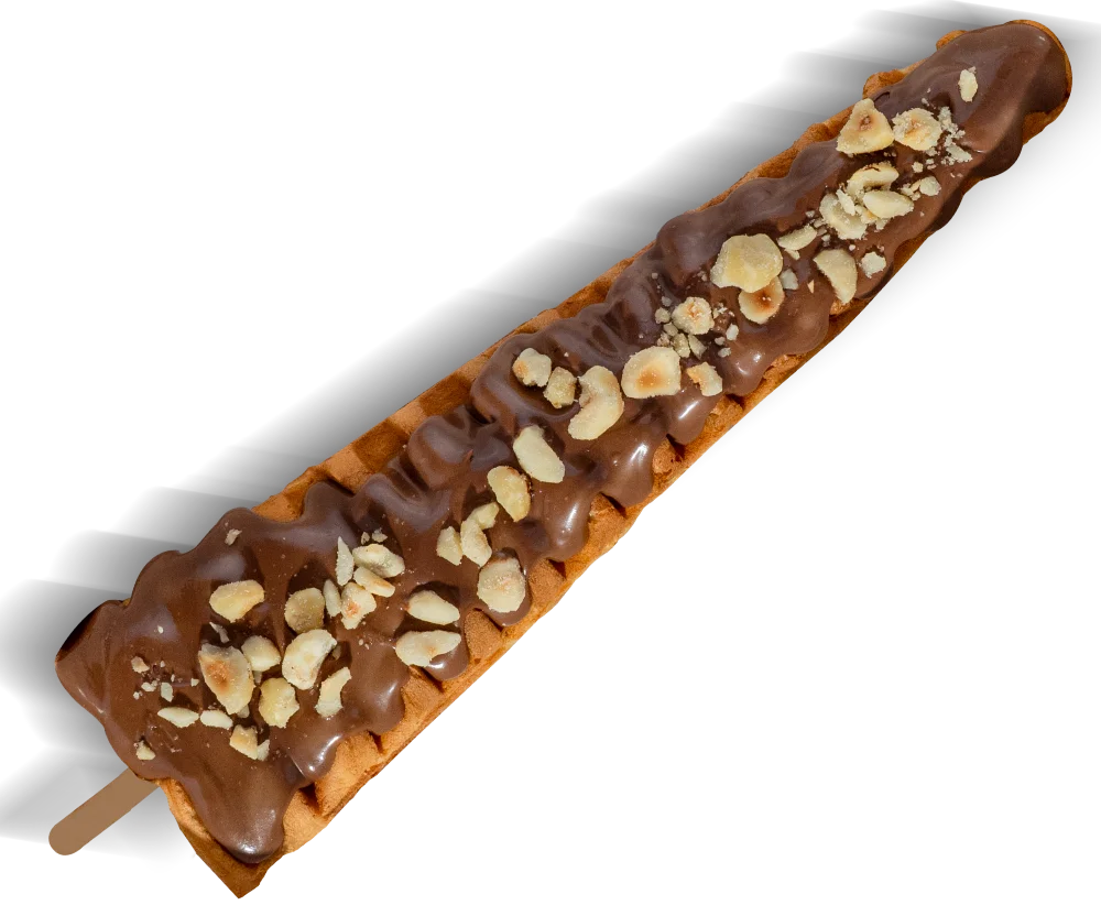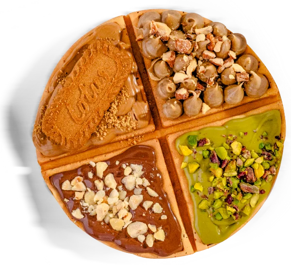 A freshly made waffle topped with a delicious selection of premium flavors and sauces. Crispy on the outside