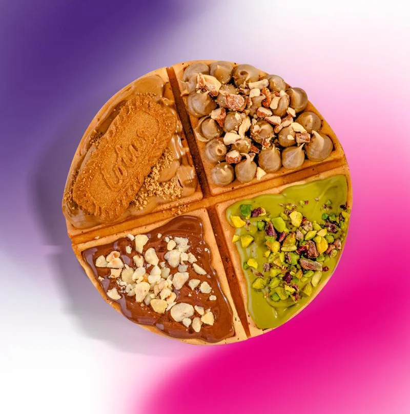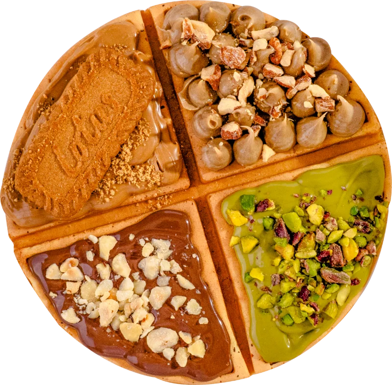A freshly made Quarto Waffle, crispy on the outside and topped with premium flavors and sauces.